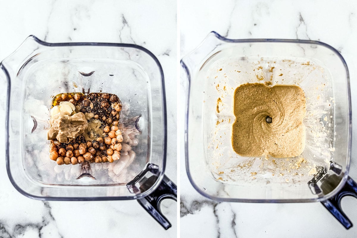 - In a high-powered blender or food processor, combine the chickpeas, ¼ cup tahini, ¼ cup aquafaba, 1 garlic clove, lemon juice, ½ tsp sea salt, and a few cracks of black pepper. Blend until mostly smooth.