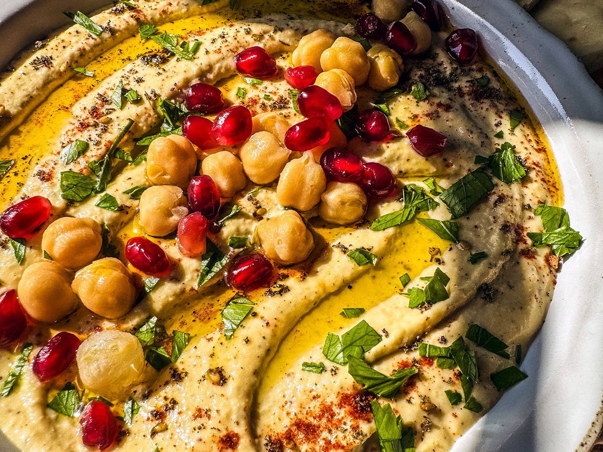 - Transfer the hummus into a shallow bowl and use the back of a tablespoon or teaspoon to make swoops and swirls. Drizzle with more olive oil, sprinkle with za’atar and paprika, and top with a few chickpeas and fresh parsley. Want to be extra? Toss on some pomegranate seeds for a juicy pop.