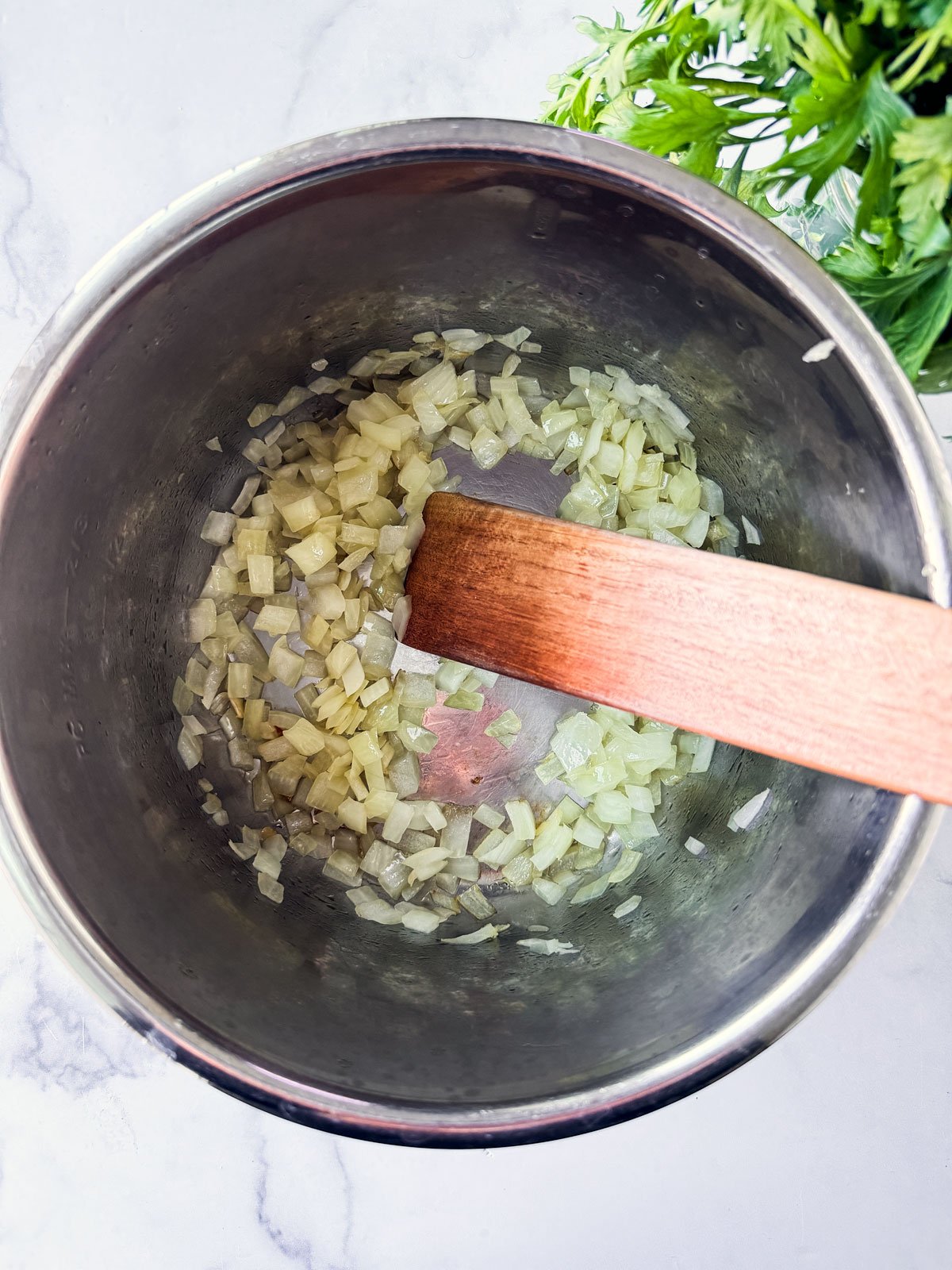 • Step 1. Activate the Sauté on normal/medium (not high). When the pot is warm, drizzle in the oil and add the onions. Let them cook for about 5 minutes or until they’re soft and fragrant, stirring occasionally.