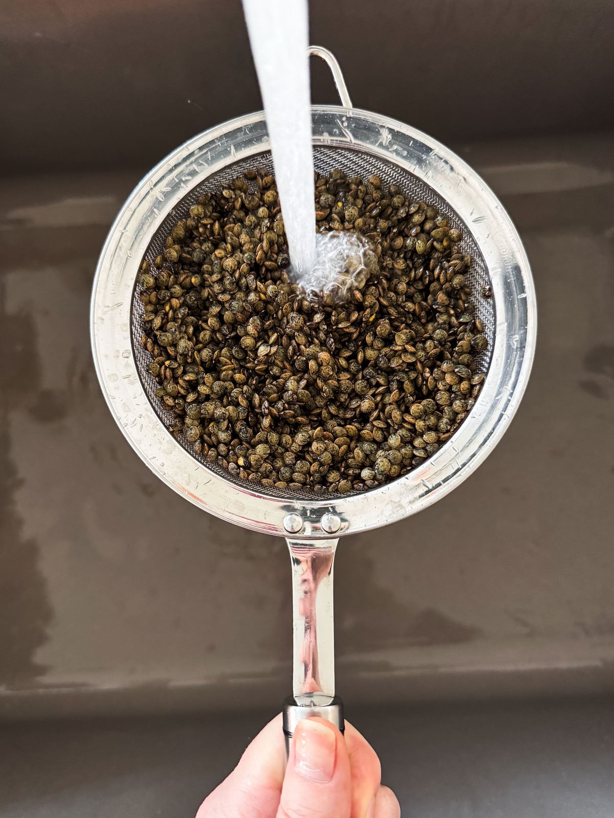 Step 3. While the veggies are cooking, dump your uncooked lentils into a colander and rinse them under cool water, going through them with your hands to look for any hardened bits or small rocks (it happens).