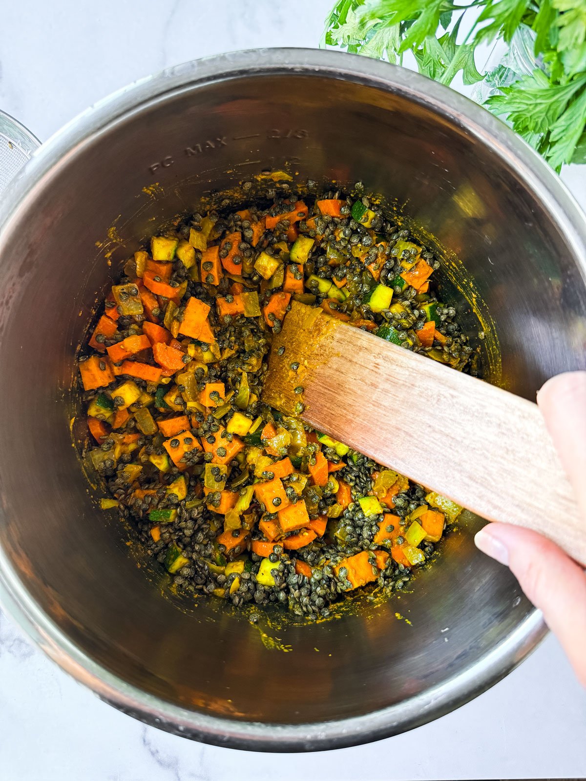 • While the veggies are cooking, dump your uncooked lentils into a colander and rinse them under cool water, going through them with your hands to look for any hardened bits or small rocks (it happens). When clear, stir the lentils into the Instant Pot coating them in the spices.