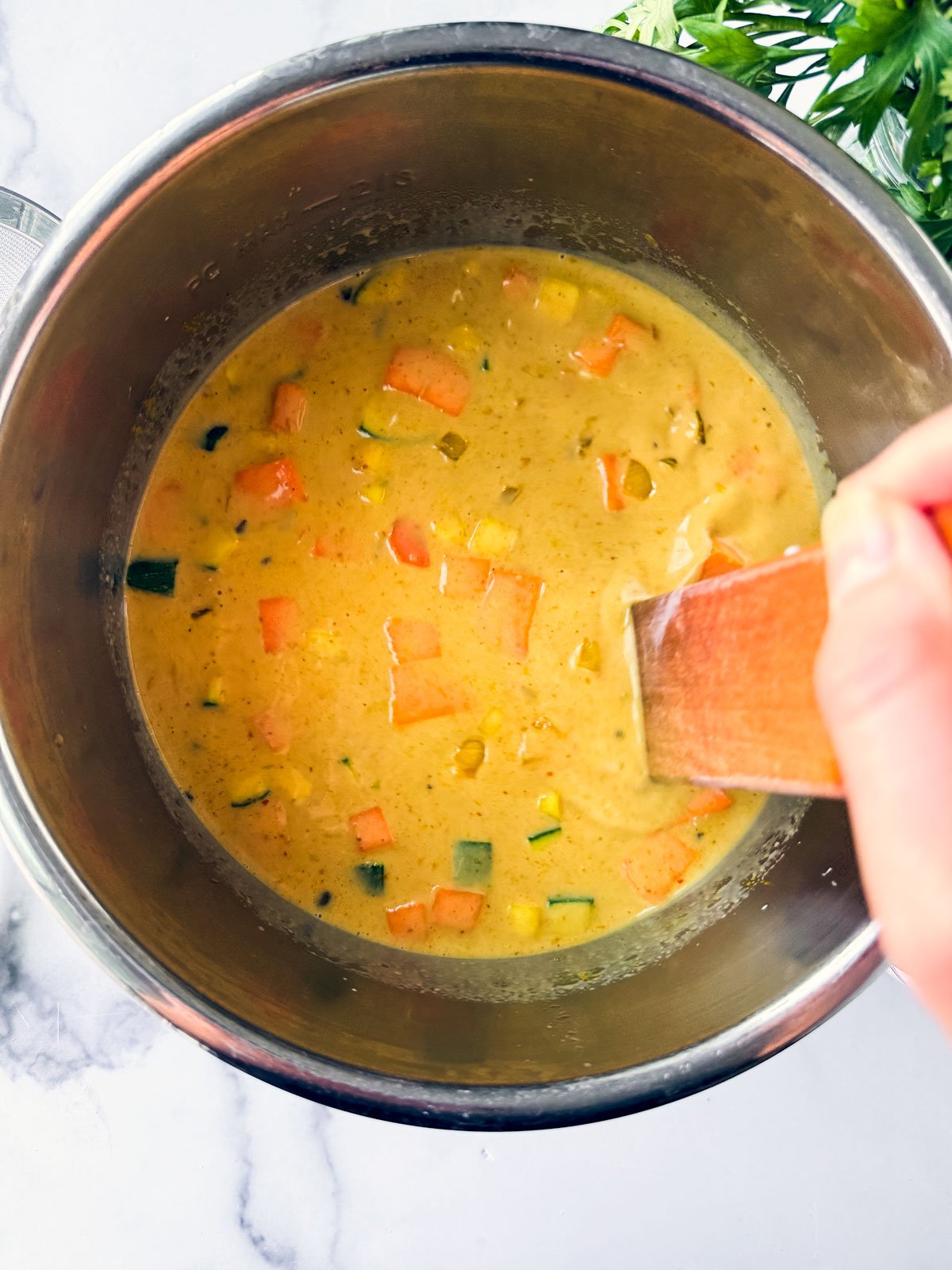 • Cancel the Sauté function. Now, stir in the coconut milk and vegetable broth; stir everything well until it's all blended.