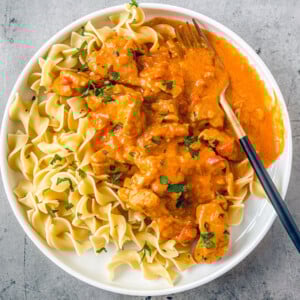 I like serving this recipe spooned over egg noodles just like I do with beef stroganoff, or a pile of creamy mashed potatoes. You could also serve it over spaetzle! On the side, air fryer green beans or oven-roasted broccoli work well.