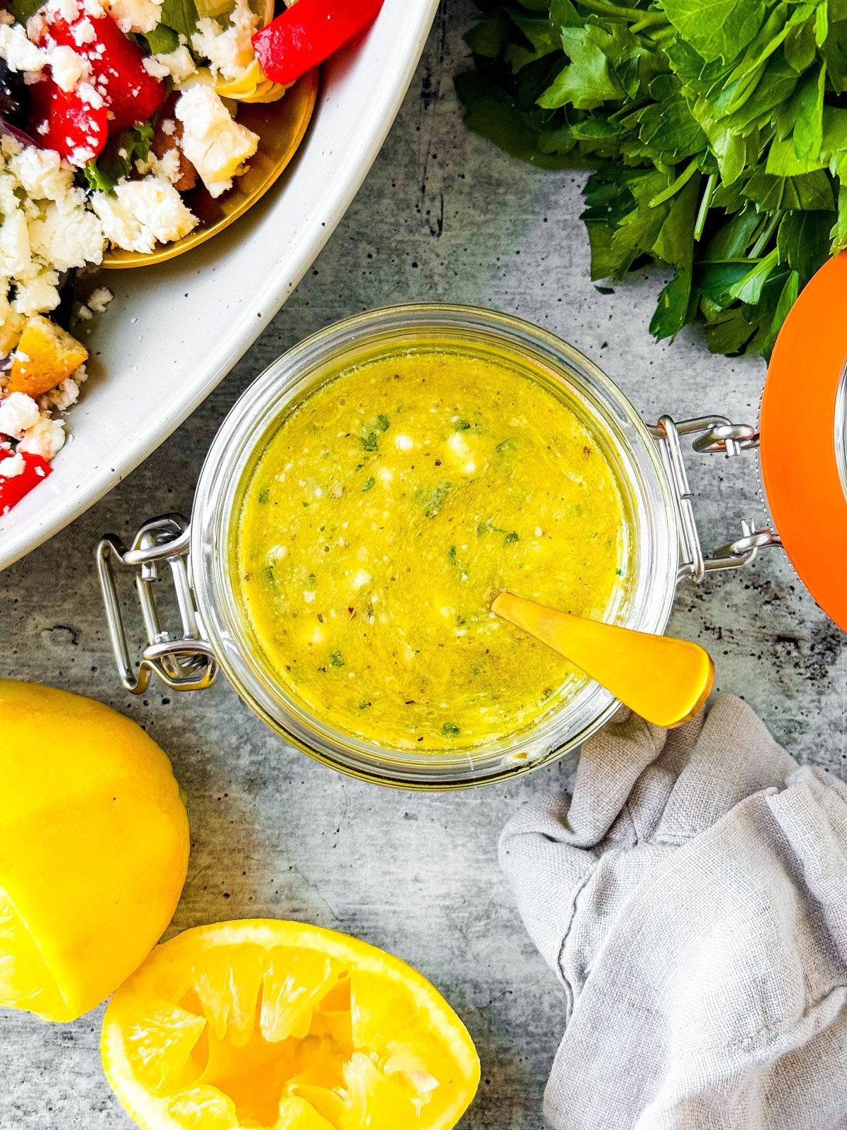 This is great on a veggie loaded Greek salad or this grilled Greek steak salad. You could also drizzle it over veggies. Think grilled asparagus, air fryer green beans, or these beautiful roasted mini potatoes!