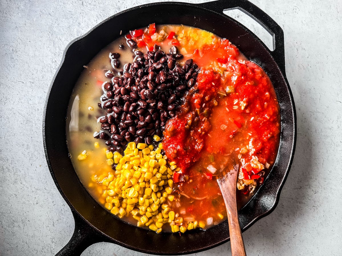 - Add the black beans, corn, chicken stock, and about 3/4 of the salsa (leave a bit to top the chicken in the next step). Give everything a good stir. Bring the liquid to a simmer over medium-low heat, then remove the skillet from the burner.