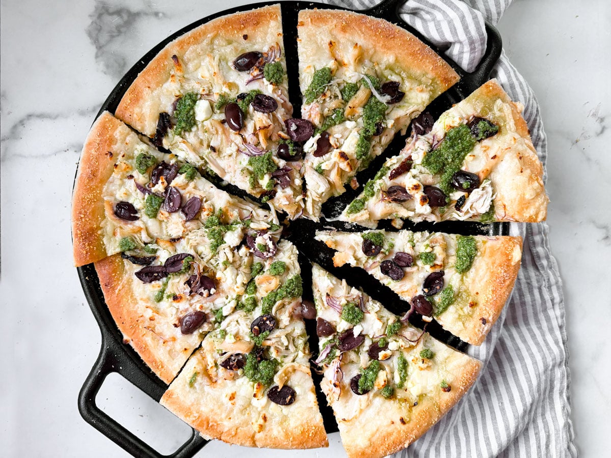 This pesto chicken pizza is hearty, delicious, and a great way to switch things up on pizza night. You get tender rotisserie chicken, kalamata olives, red onion, and, of course, crumbles of feta—all finished off with an herbaceous drizzle of basil pesto.