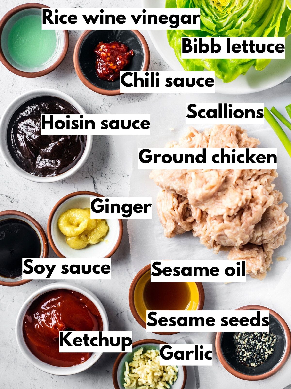 - Lettuce—Boston bibb or butter lettuce works the best. They’re shaped perfectly for acting as a cup for the chicken filling.