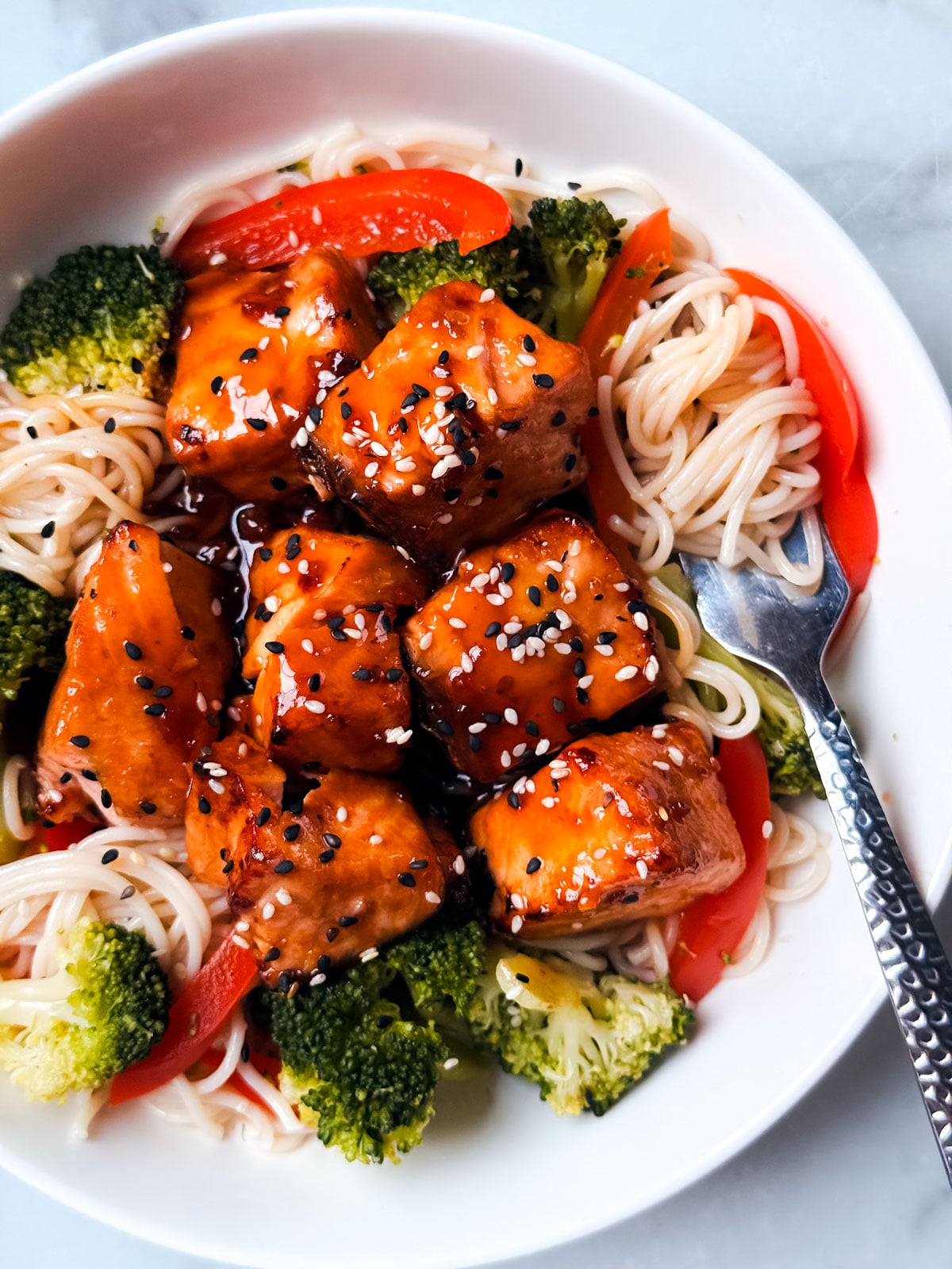 This one’s a keeper! You’ve got crisp veggies, tender salmon slathered in a homemade Teriyaki sauce, and a family favorite—Ramen noodles. These noodles are perfect for stir fry-inspired dishes, not to mention they’re incredibly easy and make for a perfect hasty weeknight meal.