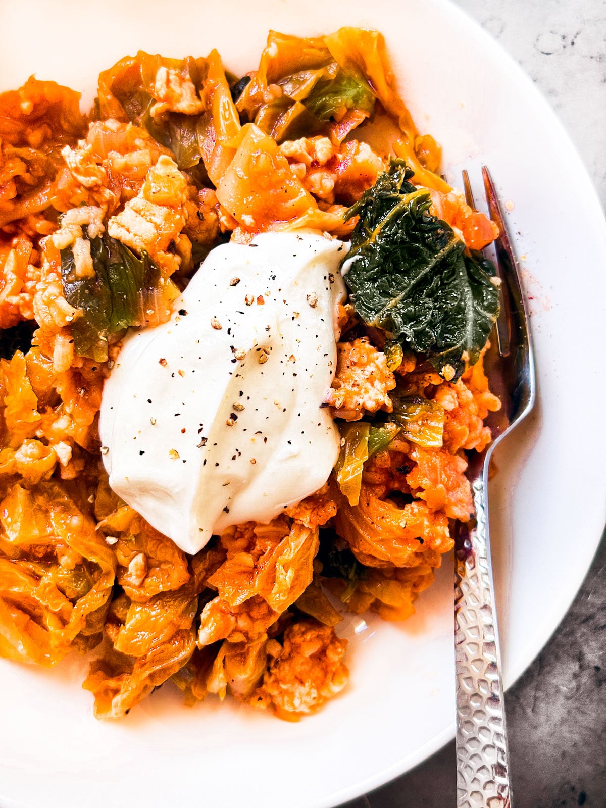 As much as I take pride in making the Ukrainian cabbage rolls I grew up on, they’re tedious and you have to set aside an entire afternoon to make them. There’s the hand-rolling and the hours of baking…not exactly ideal when you’ve got a busy schedule! And not at all ideal when the craving for cabbage rolls randomly hits you midweek. That’s why I love this comfort food recipe for unstuffed cabbage rolls so much. It’s an incredibly simple and hearty skillet meal that you can whip up for dinner on any given weeknight, it’s super flavorful, and it’s great leftover.