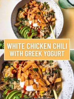White chicken chili and beef chili are not the same thing, and they’re not trying to be. One is deep, rich, tomato-heavy—the kind of thing that sits with you. The other is creamy, a little spicy from green chiles, and built around chicken instead of beef. Both are comfort food—they’re just doing very different things! My little trick is to use plain Greek yogurt instead of sour cream or cream cheese to amp up the protein while keeping things decadent.